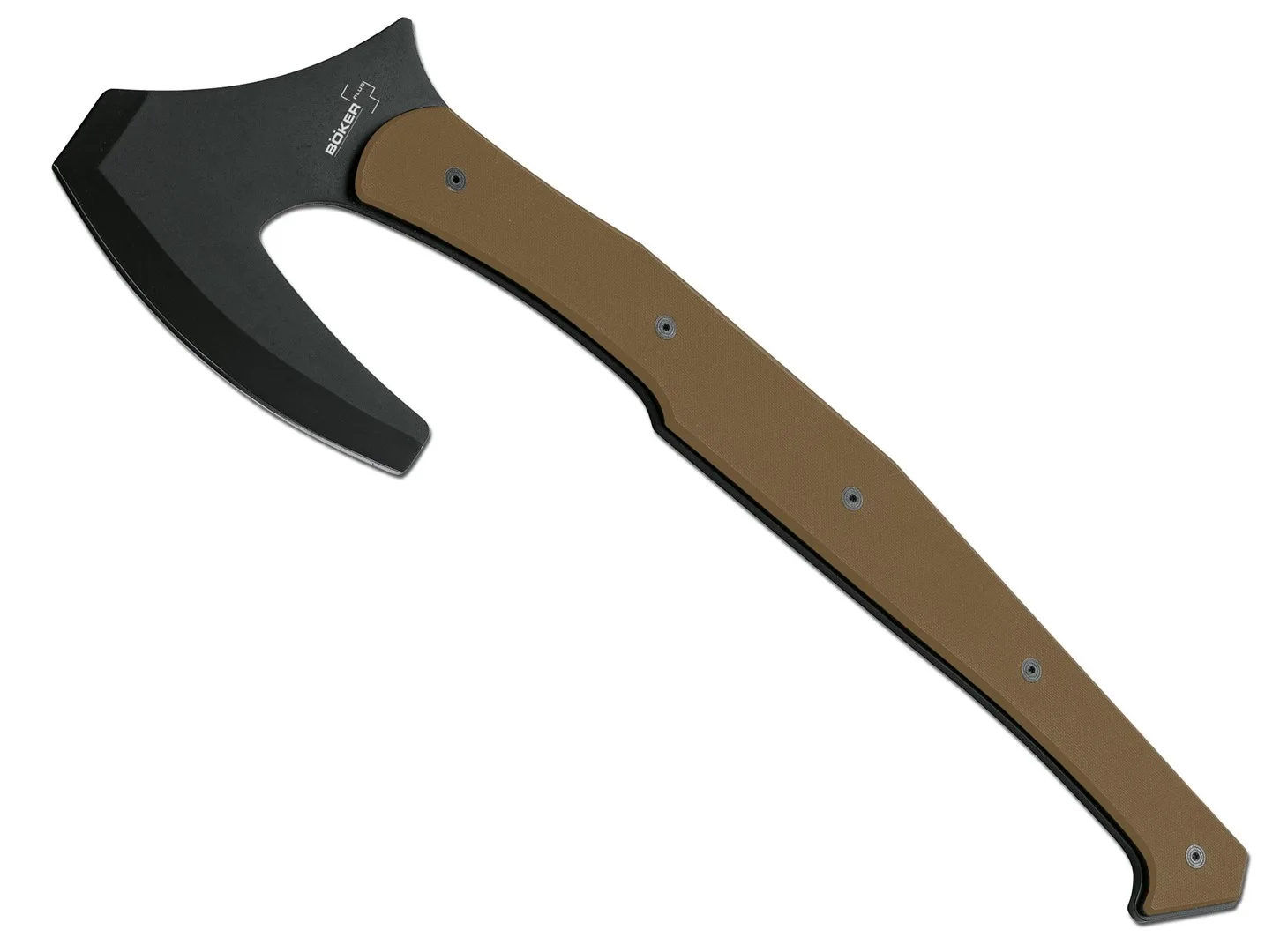 Colin Despins, projektant zasobów taktycznych z USA, przedstawił nam zupełnie nową konstrukcję taktycznego tomahawka. Projekt Boker Plus Tomahook jest inspirowany Celtami, Wikingami i rdzennymi Amerykanami, oferując wysoki stopień funkcjonalności dzięki swojej wszechstronności. A więc oczywiście może służyć do znacznie wielu więcej działań niż zwykła siekiera, chociaż jego szeroka, ostra krawędź sprawia, że jest to bardzo efektywne. Górny koniec główki siekiery jest zaostrzony jak dłuto i doskonale nadaje się na przykład do podważania otwartych pudełek. Tomahook doskonale nadaje się również jako łopata. A ostrze przypominające nóż może być nawet użyte do oskórowania i rozczłonkowania jelenia w nagłych wypadkach. Możliwość bezpośredniego i bezpiecznego zaczepienia rękojeści za krawędzią tnącą umożliwia różnorodne, dokładniejsze cięcie. Podobnie to wgłębienie może być również używane jako haki do różnych zastosowań. Grzbiet główki siekiery ma zaokrąglony punkt uderzenia, który może służyć np. jako zbijak do szyb. Specjalna konstrukcja osłony Kydex pozwala na utrzymanie osłony w wielu zastosowaniach roboczych i tnących. Wpuszczone wagi G10 nie tylko umożliwiają bezpieczne i wygodne trzymanie Tomahook. Prawie każdy punkt trzpienia nadaje się do wykorzystania jako narzędzie. Na główce siekiery znajduje się nawet uchwyt, który umożliwia bezpieczne używanie stalowej końcówki jako narzędzia udarowego. Zastosowano sprawdzoną stal węglową SK5, która dzięki kolejnej powłoce staje się odporna na korozję. Stal węglowa SK5, mimo że nie jest odporna na korozję, jest idealnym materiałem na ten taktyczny tomahawk, jednak ze względu na charakter tej stali może czasami wykazywać lekką korozję na niepowlekanej krawędzi, którą można usunąć krótkim ostrzeniem . Wysokiej klasy narzędzie taktyczne z mnóstwem opcji!
