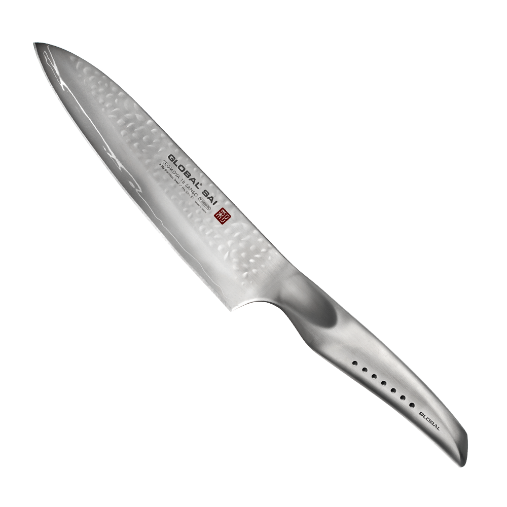 W klingach noży Global SAI zastosowano materiał CROMOVA 18 SANSO. Rdzeń ze stali nierdzewnej CROMOVA 18, o twardości 56-58 HRC, obłożono dwiema warstwami miękkiej stali nierdzewnej SUS410. Dzięki temu ostrze jest bardziej wytrzymałe i odporniejsze na pęknięcia, przebarwienia czy korozję. Płazy głowni posiadają ręcznie młotkowaną powierzchnię, która zapobiega przywieraniu produktów do noża. Grzbiet klingi jest lekko zaokrąglony, aby zwiększyć komfort pracy dłonią. Nowe, ergonomiczne rękojeści są doskonale wyważone, a innowacyjne wgłębienie na kciuk zapewnia lepszą kontrolę nad nożem oraz wygodę podczas pracy. Jednolita konstrukcja sprawia, że noże są higieniczne i łatwe w ostrzeniu.