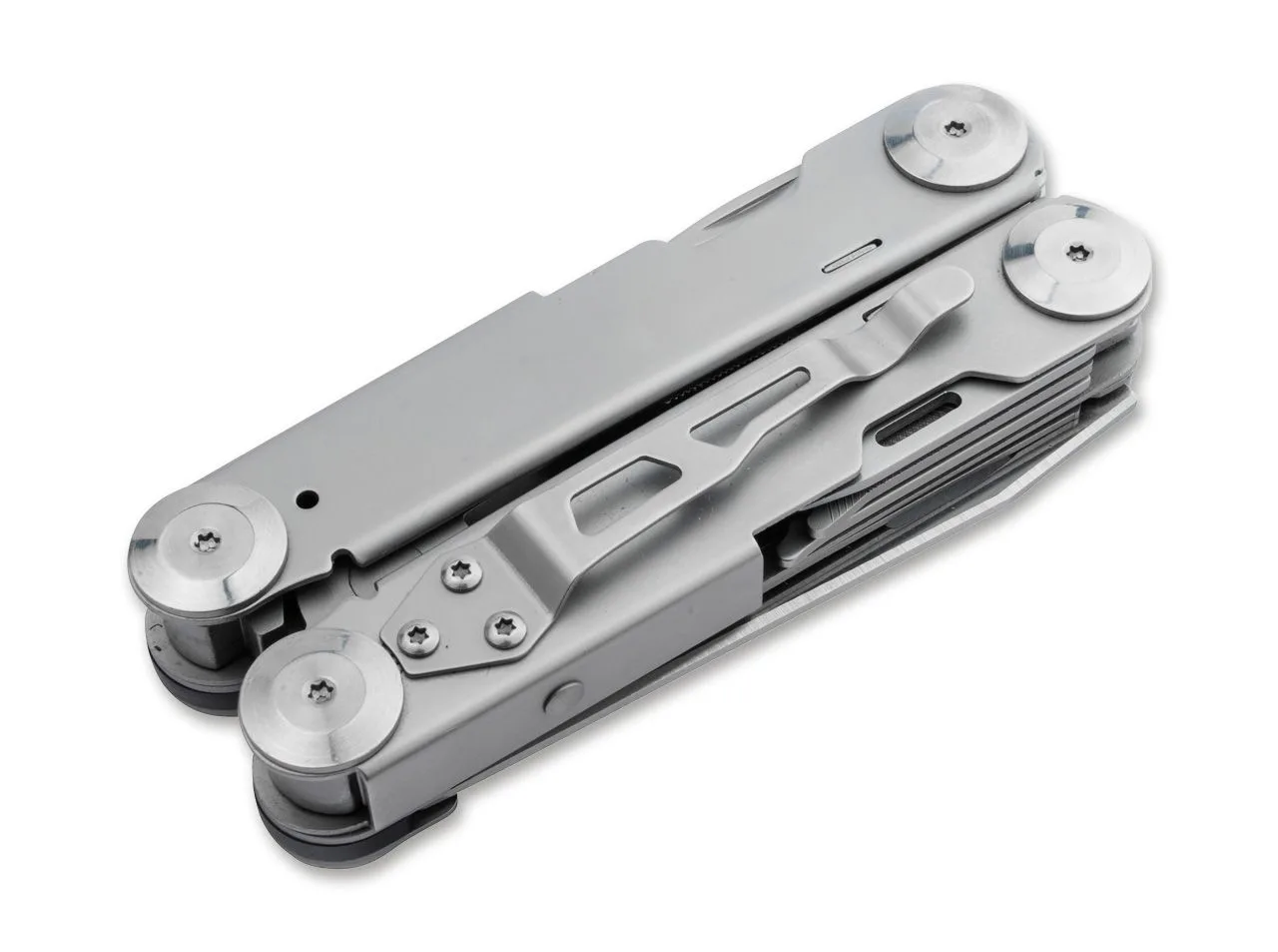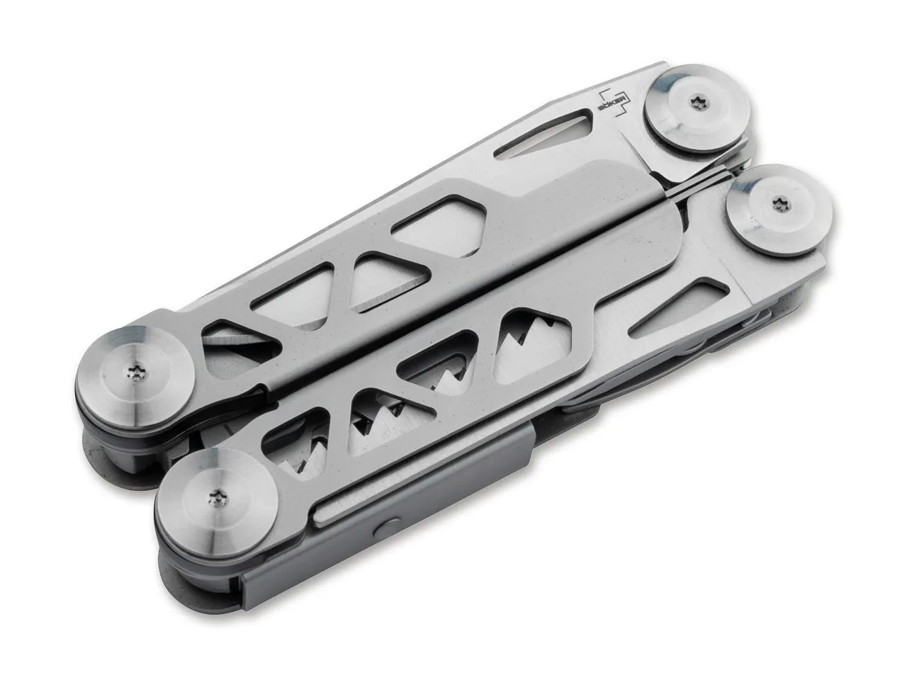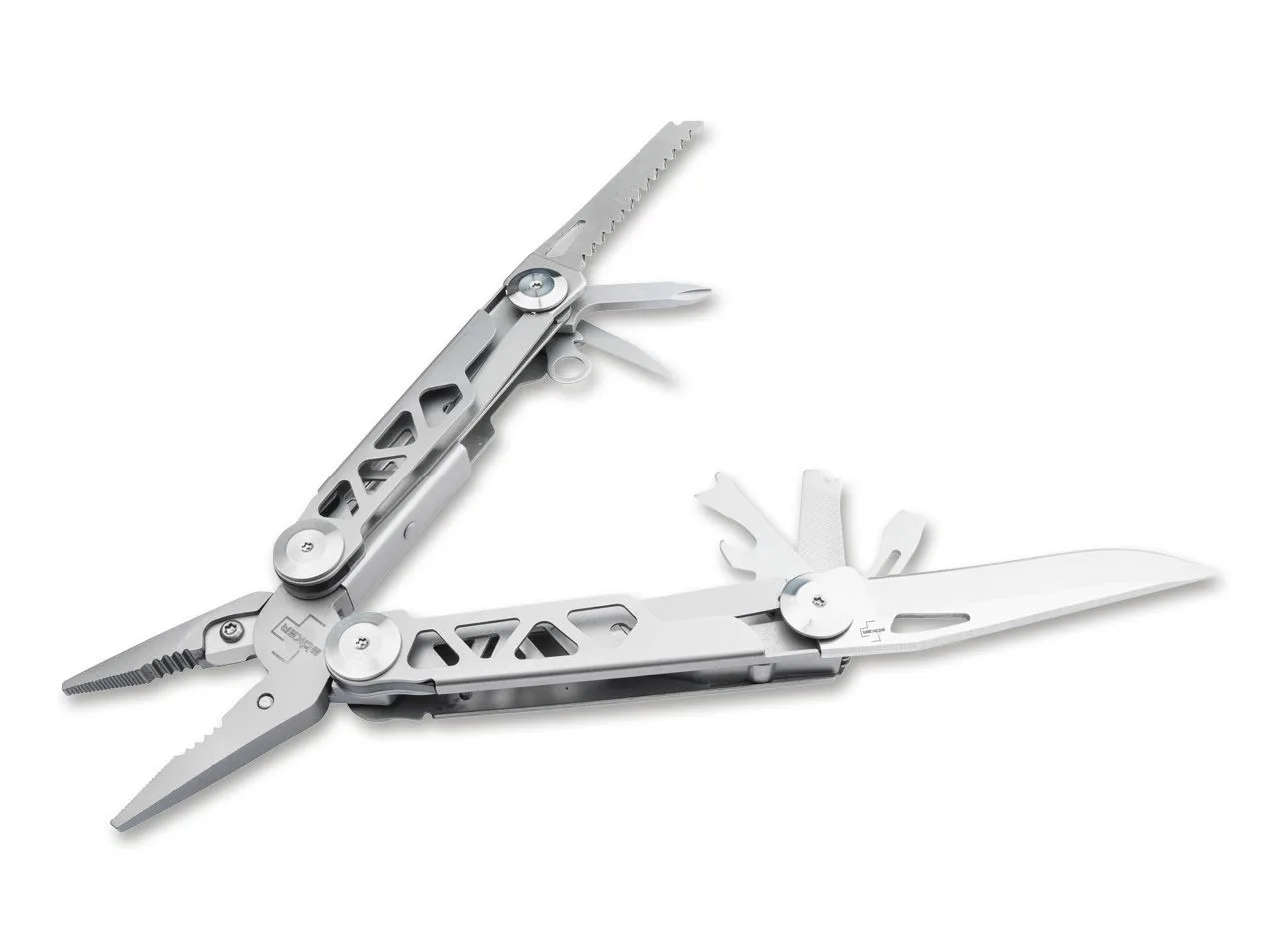 Wyposażony w różne praktyczne narzędzia, Boker Plus Specialist Pro to wszechstronne narzędzie wielofunkcyjne ze sprężynowymi szczypcami. Posiada wzmocniony, wymienny przecinak do drutu i wytrzymuje duże obciążenia. Oprócz płaskiej powierzchni chwytnej, szczypce posiadają również tak zwany otwór palnikowy do chwytania śrub z łbem sześciokątnym, nakrętek złączkowych i rur. Narzędzia umieszczone w dwóch połówkach rękojeści otwierają się płynnie i można ich używać szczególnie bezpiecznie dzięki niezawodnemu mechanizmowi blokującemu. Oprócz kombinerek na wyposażeniu multitoola znajduje się również ostrze gładkie, piła do drewna, otwieracz do puszek, otwieracz do butelek, giętarka do drutu, szydło do wiercenia/szycia, śrubokręt krzyżakowy, śrubokręt płaski oraz metal plik. Korpus klamki wykonany ze stali nierdzewnej posiada ozdobne wycięcia. W zestawie otwór na smycz, klips i wysokiej jakości nylonowy pokrowiec na pasek.