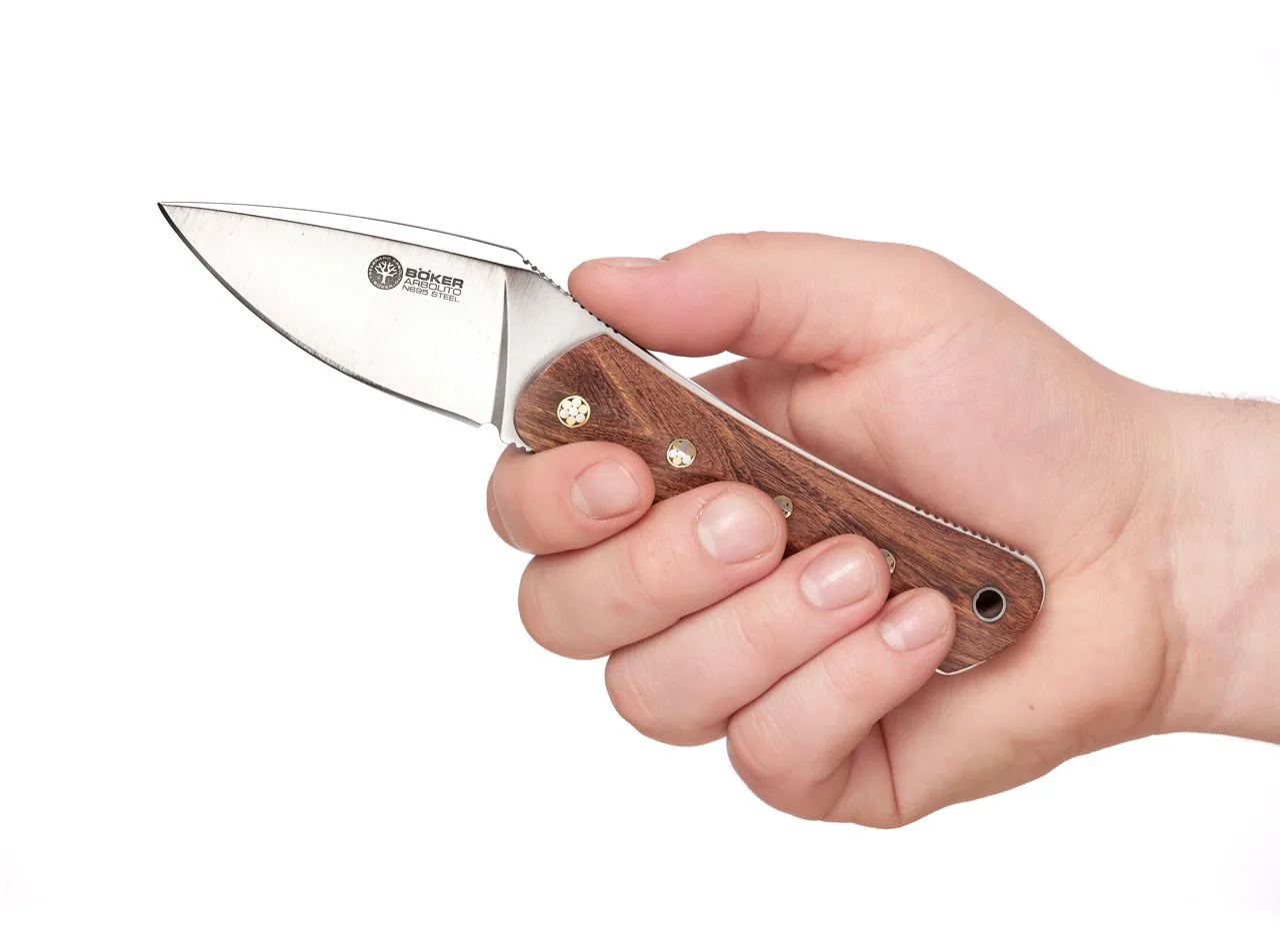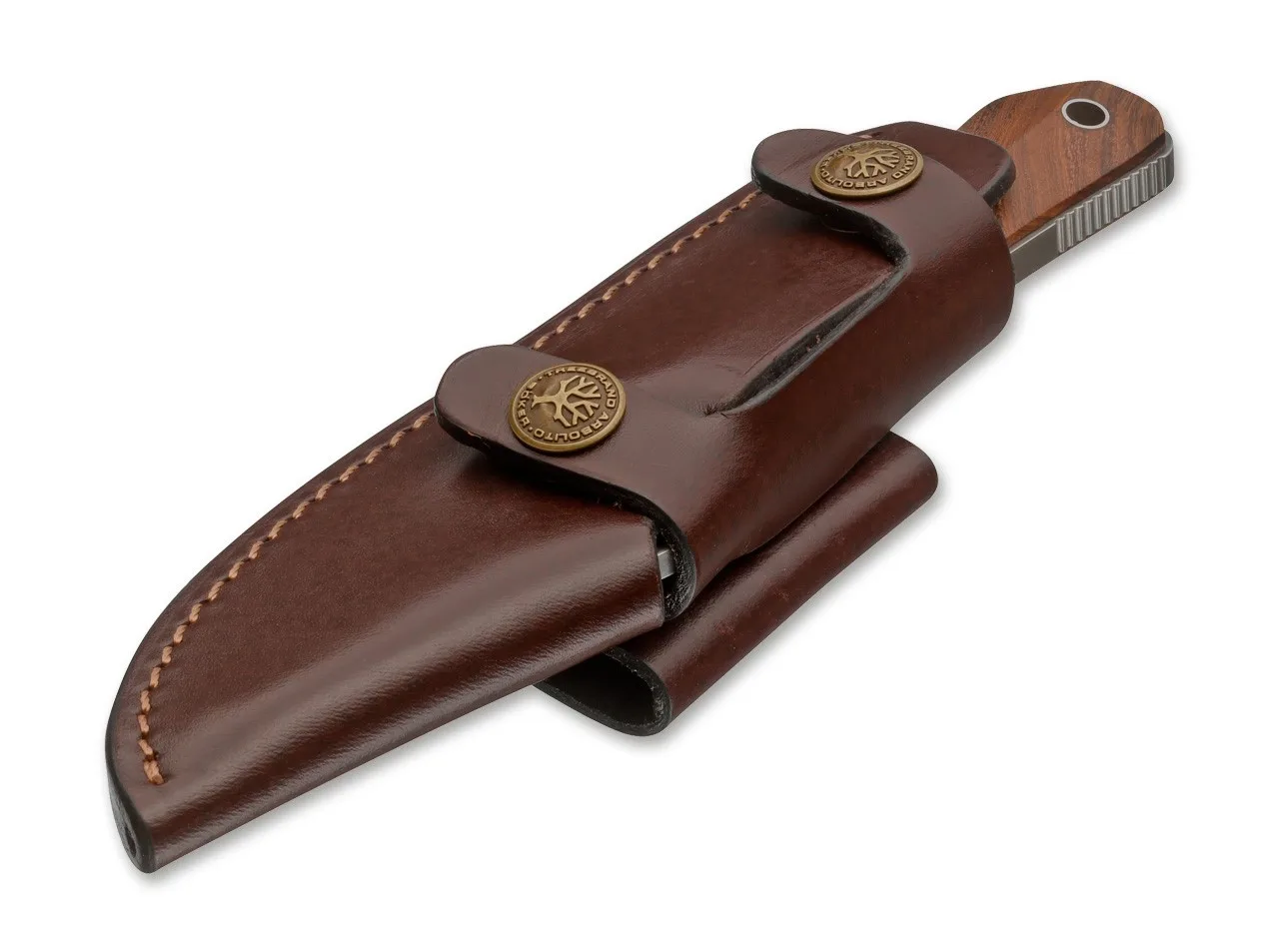 Die klaren Linien des Böker Arbolito Nomad und die kräftige, blattförmige Klinge verleihen dem Entwurf von Péter Farkas ein außergewöhnliches Erscheinungsbild und eine ausgezeichnete Ergonomie. Die facettierten und leicht zurückgesetzten Griffschalen aus Guayacan-Ebenholz sind mit dekorativen Mosaikpins befestigt. Riffelungen um den Erl erhöhen den Grip. Die Klinge wird aus Böhler N695 gefertigt. Lieferung mit quer zu tragender Lederscheide.