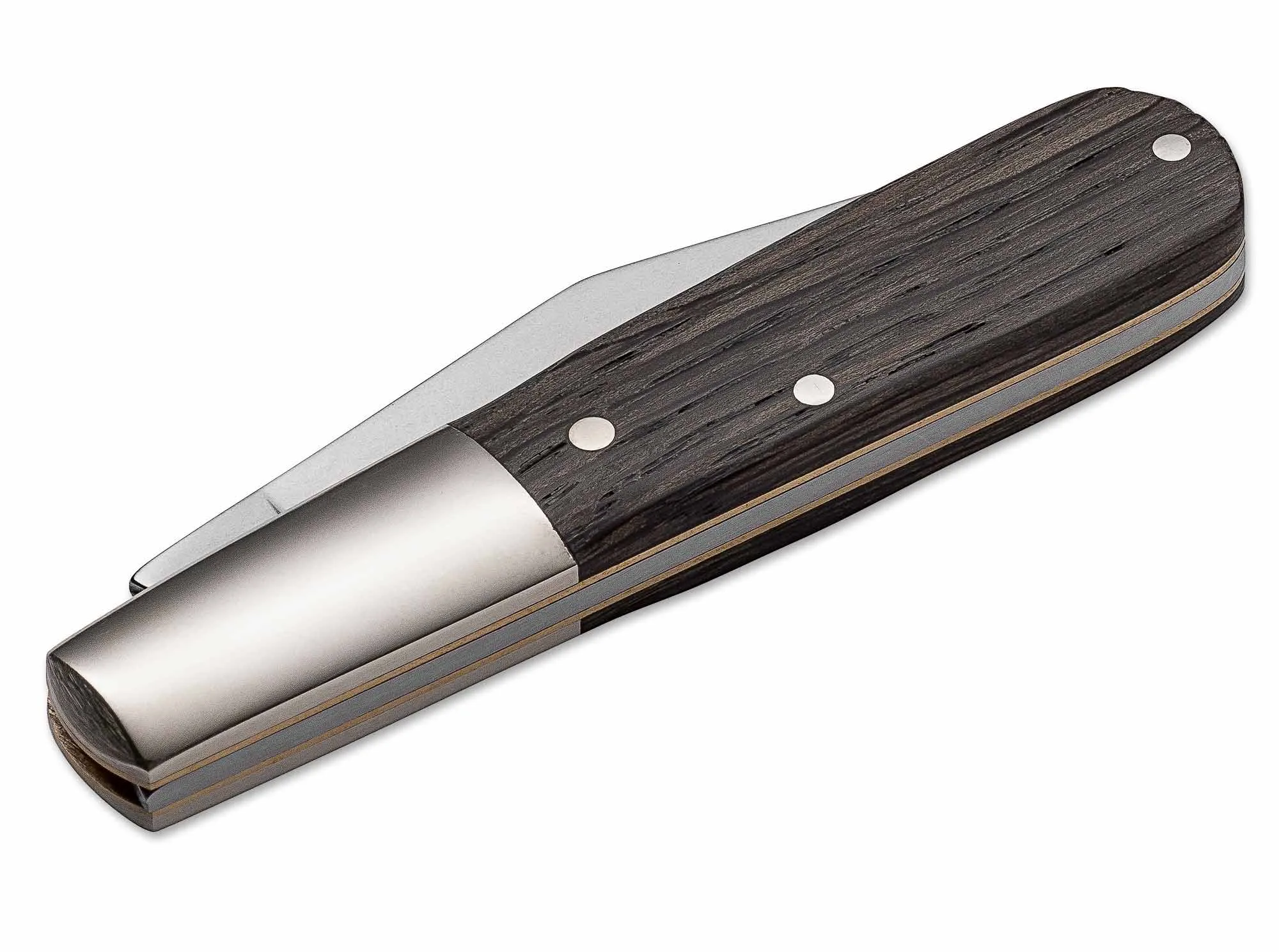 Das klassische Modell Barlow mit seiner charakteristischen überlangen Neusilberbacke und der breiteren Klinge ist einerseits ein kleiner, absolut hosentaschentauglicher Begleiter, andererseits aber auch groß genug, um die meisten Schneidarbeiten des Alltages problemlos zu bewältigen. Die polierte Klinge wird aus 440C gefertigt, und für die Beschalung kommt edles Grenadill zum Einsatz, welches zertifiziert importiert wird.