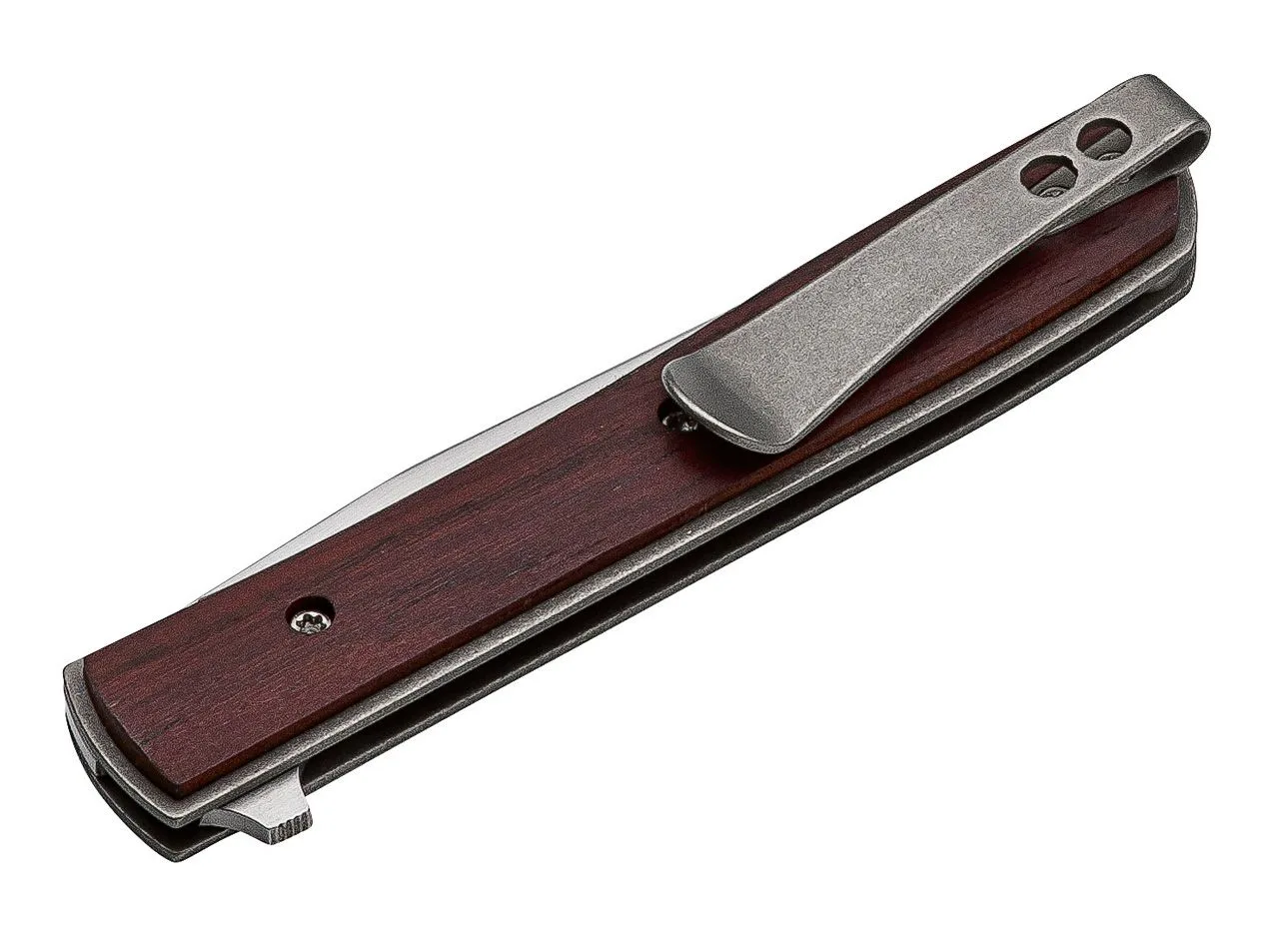 Klinga ze stali VG-10, długość całkowita 157 mm, długość klingi 70 mm, grubość klingi 2.0 mm, waga 33 g, rękojeść drewno Cocobolo, blokada Framelock, klips.