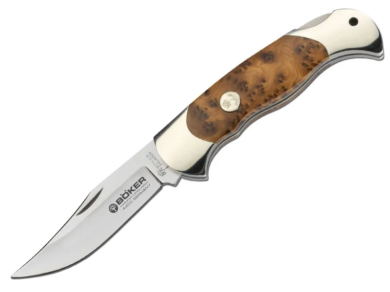 Klinga wykonana ze stali 440C. Okładki rękojeści z drewna tui z zakończeniami z niklowanego mosiądzu. Blokada Lock Back. Design by U. Look.