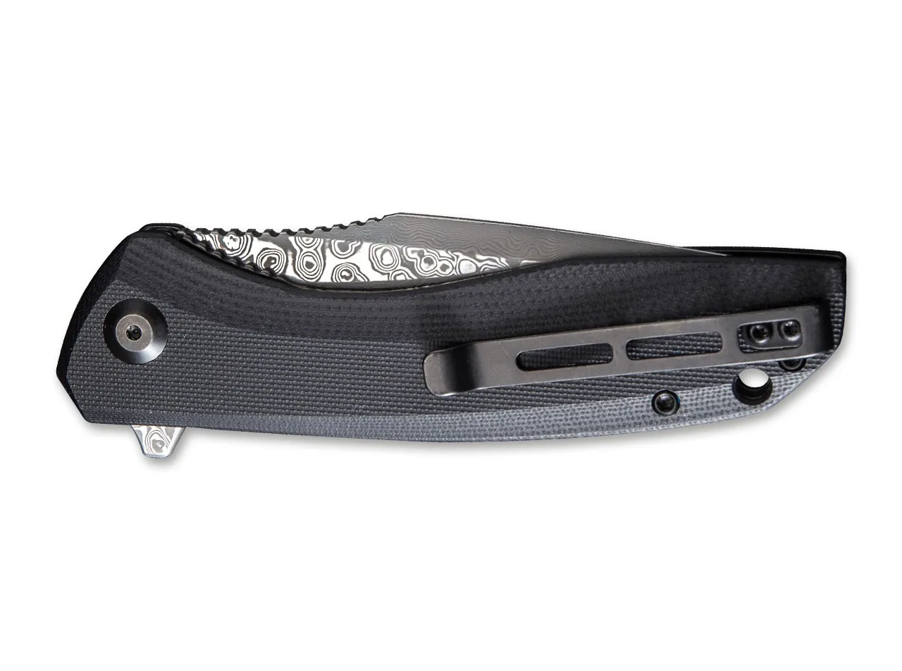 CIVIVI Baklash Damascus ma ostrze na łożyskach kulkowych, które otwiera się za pomocą płetwy. Rękojeść składa się z teksturowanego czarnego G10 na szkieletowych wkładkach ze stali nierdzewnej, służących również jako podstawa dla niezawodnego linerlocka. Lekki, nowoczesny scyzoryk damasceński oferuje prawie bezkonkurencyjny stosunek jakości do ceny. Dzięki repozycjonowanemu głębokiemu klipsowi do noszenia (tip-up / l-r) jest również w pełni odpowiedni dla użytkowników leworęcznych. Z otworem na smycz.