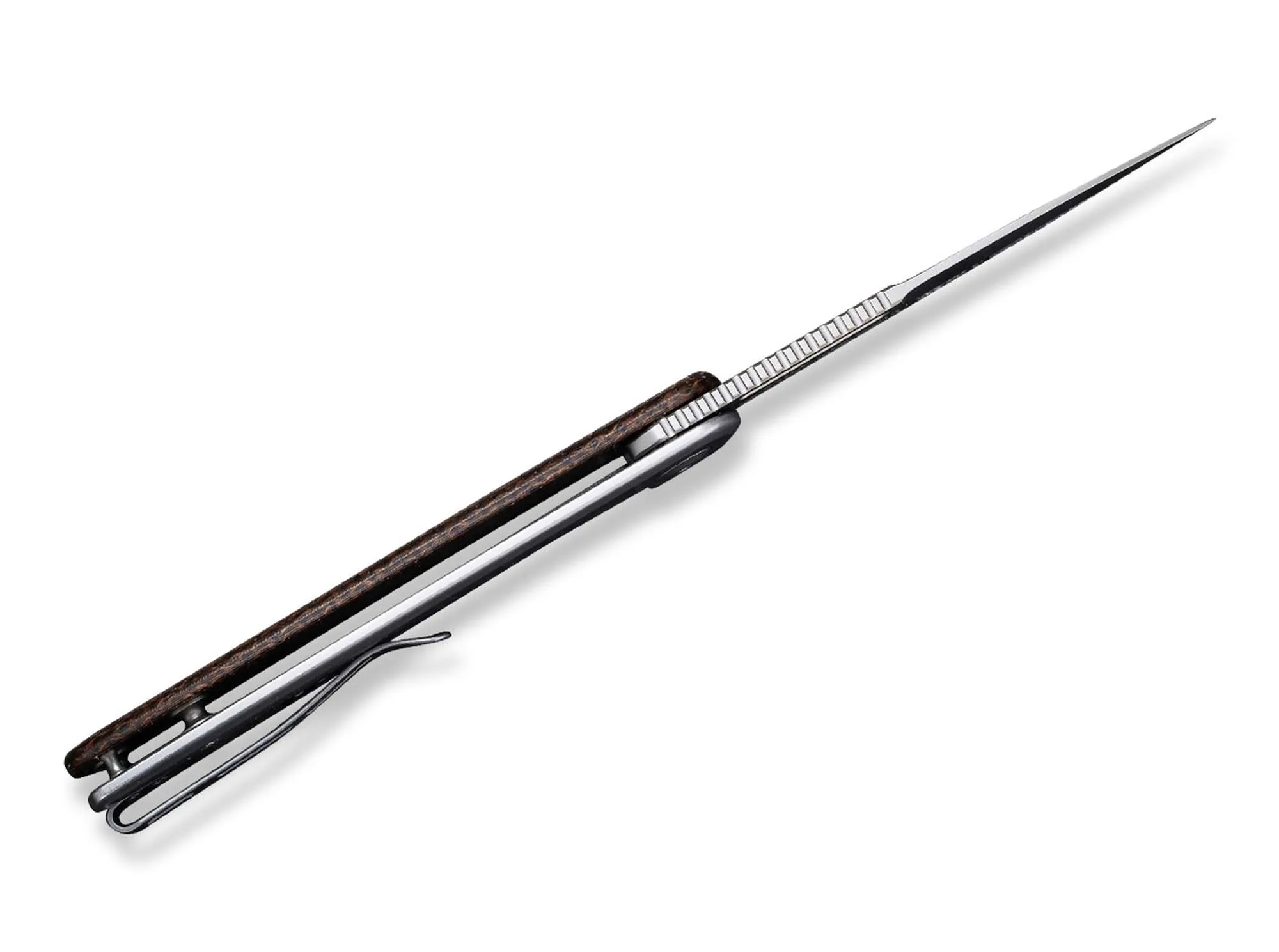 Smukły nóż EDC przekonuje prostą elegancją i jednocześnie bardzo wysokimi walorami użytkowymi. Łożyskowane ostrze Spearpoint wykonane ze stali 14C28N jest wykończone metodą Bead Blast i otwiera się płynnie flipperem lub alternatywnie wycięciem na paznokieć. Solidna blokada ramy ze stali nierdzewnej niezawodnie zabezpiecza nóż, dzięki czemu nawet trudne prace przyjdą bez wysiłku. Przednia rękojeść wykonana z brązowej Micarty podkreśla wyrazisty urok noża. Z klipsem (tip-up/r).