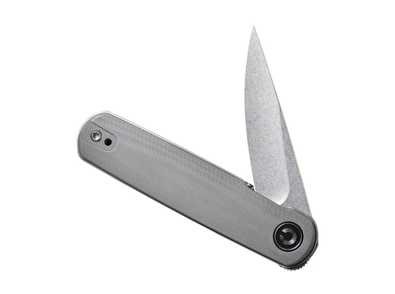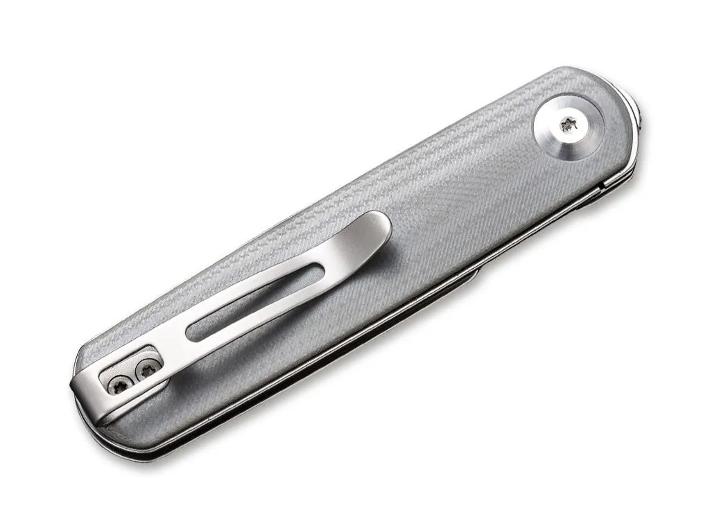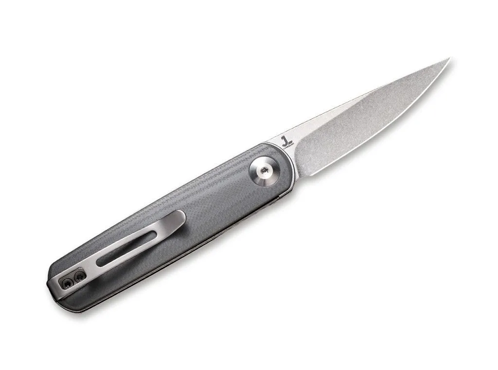 Functional and simple – that sums up the straightforward folder by Justin Lundquist. The ball-bearing Spearpoint blade made of 14C28N with a stonewash finish opens with a front flipper. The robust linerlock locks the blade in place even during difficult tasks. The grey G10 handle fits comfortably in the hand and is supplied with a convertible clip (tip-up/l+r) as an additional fastening option.