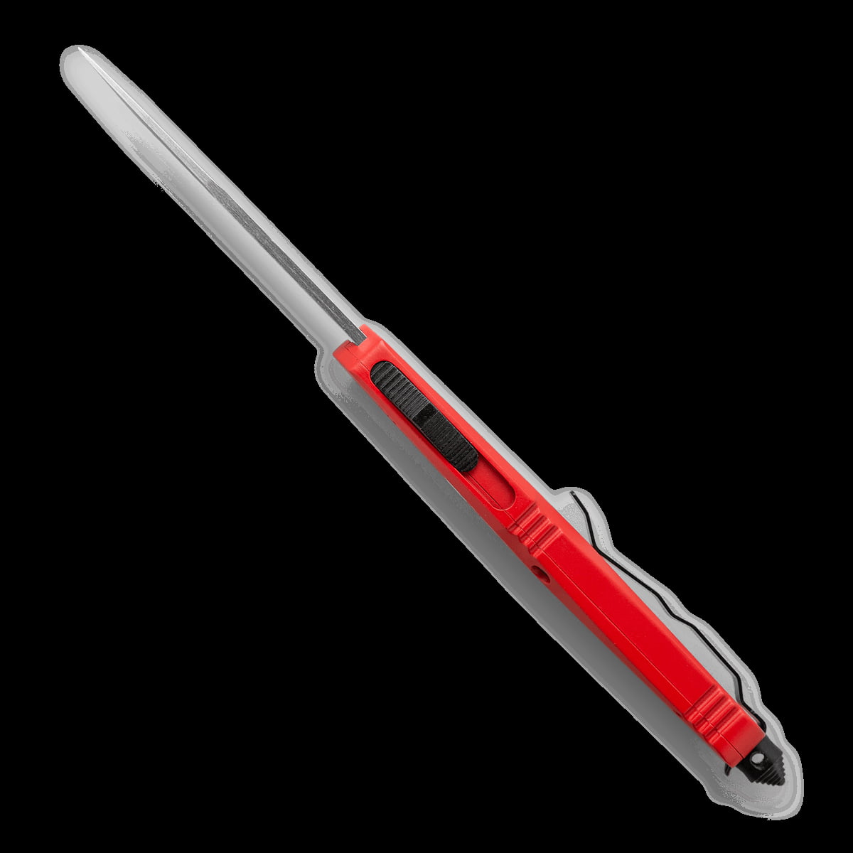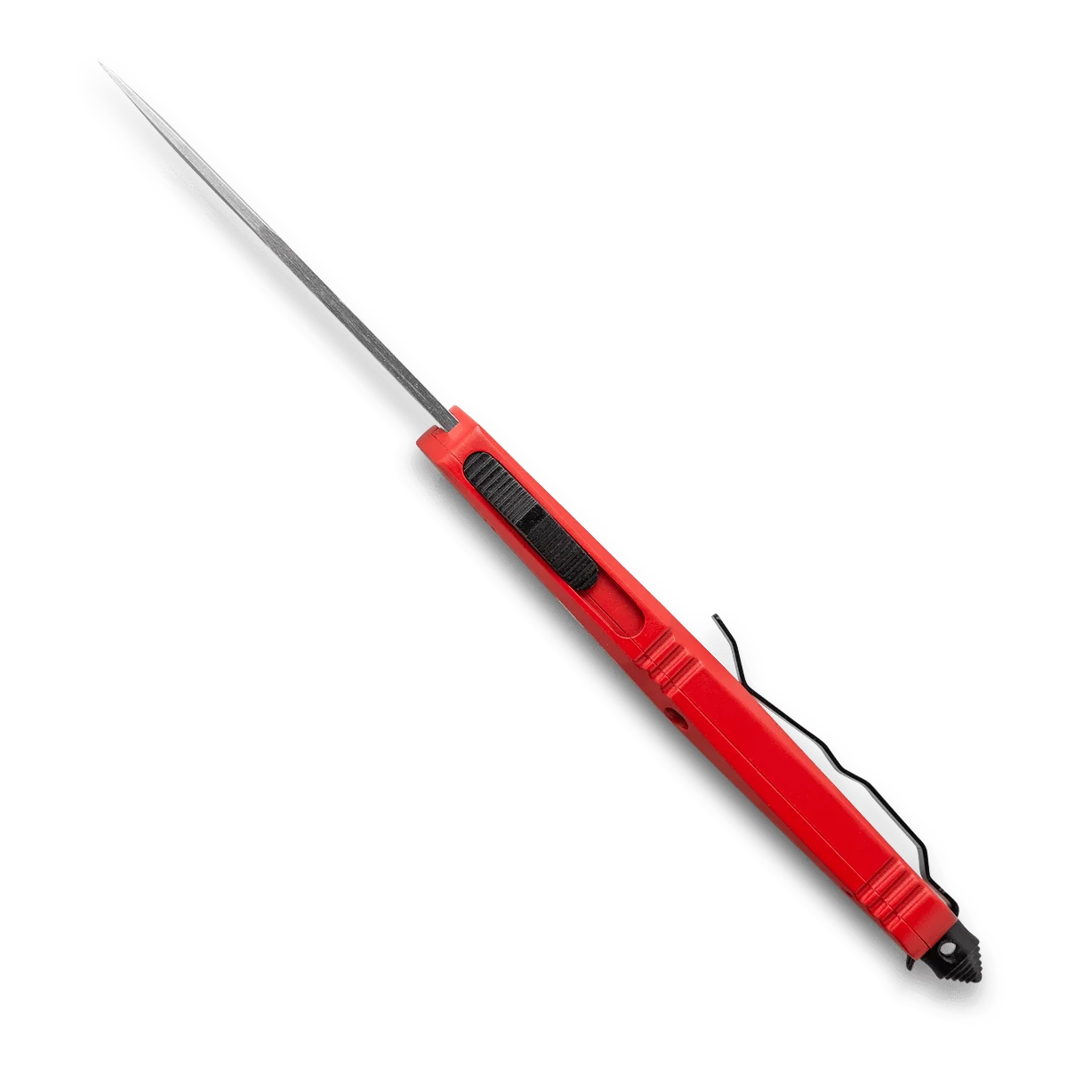 Dorosła wersja popularnego FS-3 przekonuje solidnym ostrzem typu drop point D2, które po przesunięciu suwaka wysuwa się z przedniej rękojeści tak szybko jak strzała i znika tam ponownie po ponownym przesunięciu. Nóż OTF (Out The Front) wyposażony jest w czerwoną rękojeść wykonaną z aluminium o wysokiej wytrzymałości, która przedstawia przerażającą czaszkę. Klips do przenoszenia głębokiego jest przymocowany do zbijaka do szyb i umożliwia przenoszenie po obu stronach. Dostarczany z wysokiej jakości nylonowym pokrowcem.
