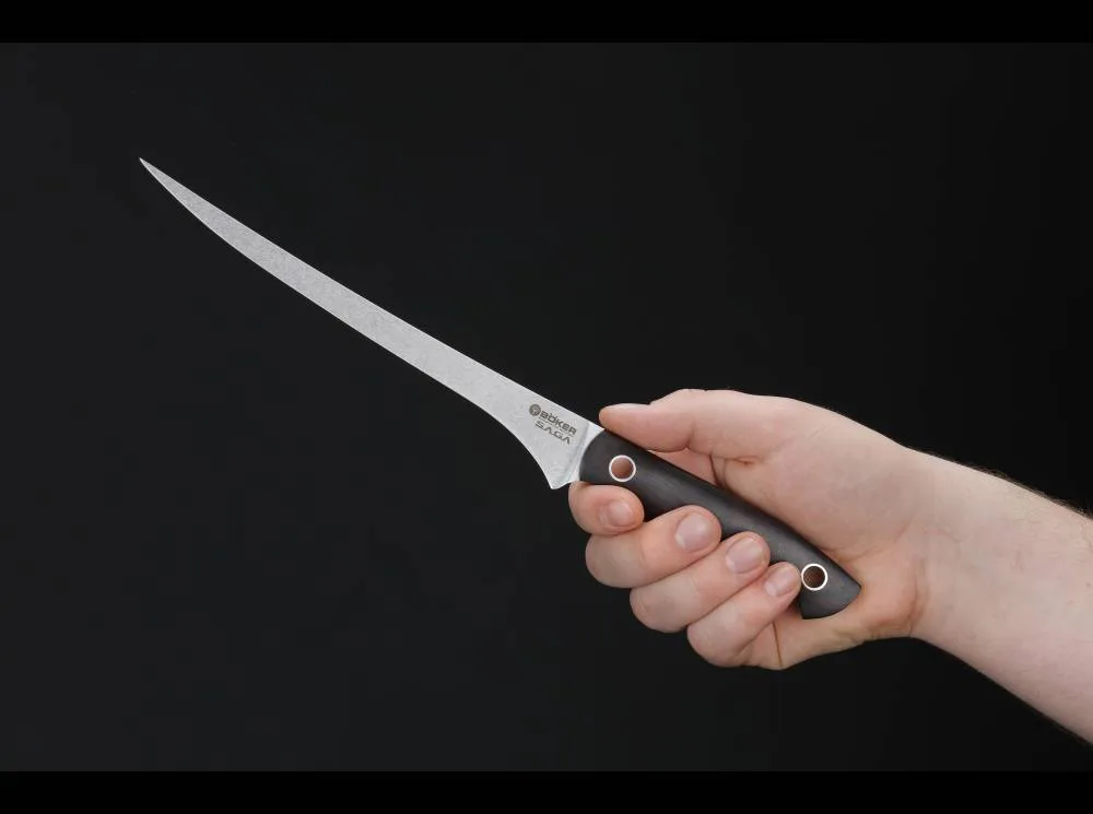 Z naszej kuchni nóż serii Boker Saga, wykonane ręcznie w naszej fabryce w Solingen, wykonujemy mostek i podnieść kwestię „cięcia w kuchni” na nowy poziom. Nasze wieloletnie doświadczenie w noże na zewnątrz, jak również pomysłowości i kreatywności producenta duński Knife Jesper Voxnaes zostały uwzględnione w koncepcji i konstrukcji Saga ustawić ergonomiczny i stukając nowe standardy techniczne. Uważny przeniesienie tego wspólnego know-how w dziedzinie, która gwarantuje kulinarnych pracujących z Boker Saga pod unikalnym doświadczeniem. Łagodnie zakrzywione uchwyty są wykonane wyłącznie certyfikowane importowanego afrykańskiej Blackwood. Dzięki wysokiej twardości i Blackwood gęstości mieści między innymi ugruntowaną pozycję w europejskich instrumentów dętych drewnianych. Już przy pierwszym kontakcie z serii Saga noża Böker skuteczne ergonomia jest jasne: Każdy arkusz, każdy pęd w linii położona na swoim miejscu w dłoni i zapewnia pełną kontrolę i doskonałe wrażenia cięcia. Jaskółczy ogon rozszerzyły Uchwyt końcowy z większych modeli przynosi dodatkową przyczepność. Wysoka stabilność zawdzięcza BöKER Saga całkowicie ciągły Erl który biegnie przez nóż (w tej samej konstrukcji, jak wiele ostrza myśliwskiej) od wierzchołka ostrza do końca uchwytu. Aby uzyskać optymalne działanie cięcia, jest pełna powierzchnia szlifująca tarczy z Stonewashed końca, ale również wybór 440C stalowego ostrza, która jest doskonała utrzymywanie krawędzi i odporność na korozję stali przekracza normalne nóż kuchenny pory. Wykończenie powierzchni wytworzonych w specjalnym procesie mielenia charakteryzuje się doskonałymi właściwościami ślizgowymi w ciętego materiału, co sprzyja już doskonałą wydajność cięcia. Ponadto mikrostruktura Stonewashed sam jest bardzo odporna na zarysowania, jak to często wizualnie verlieren..Den w strukturze akcent umieścić dużych pustych nity bezbłędnie noszą znamiona Jesper Voxnaes. Nóż do filetowania jest wykorzystywany głównie do filetowania ryb i dlatego też należy do podstawowego wyposażenia każdego wędkarza. Charakteryzuje się długi, wąski, elastyczne ostrze. ale wykorzystać go do innych celów. Gdy mięso może w ten sposób usunięty z ostrym ostrzem do filetowania ścięgien nóż lub skóry i miąższu owoców i warzyw szybko oddzielona od rdzenia.