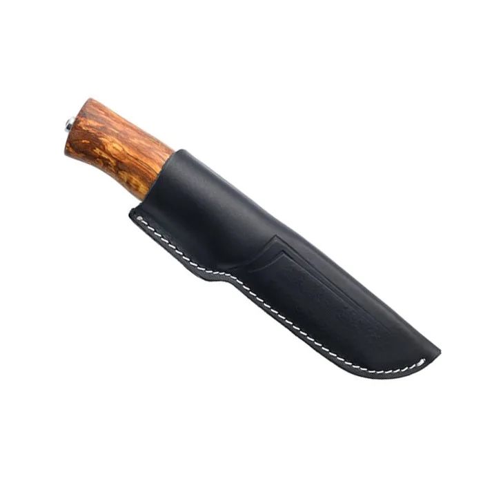 Eggen 12C27 jest wyposażony w czarną pochwę z prawdziwej skóry ze srebrnymi szwami, pasującymi do aluminiowej kolby na końcu rękojeści.