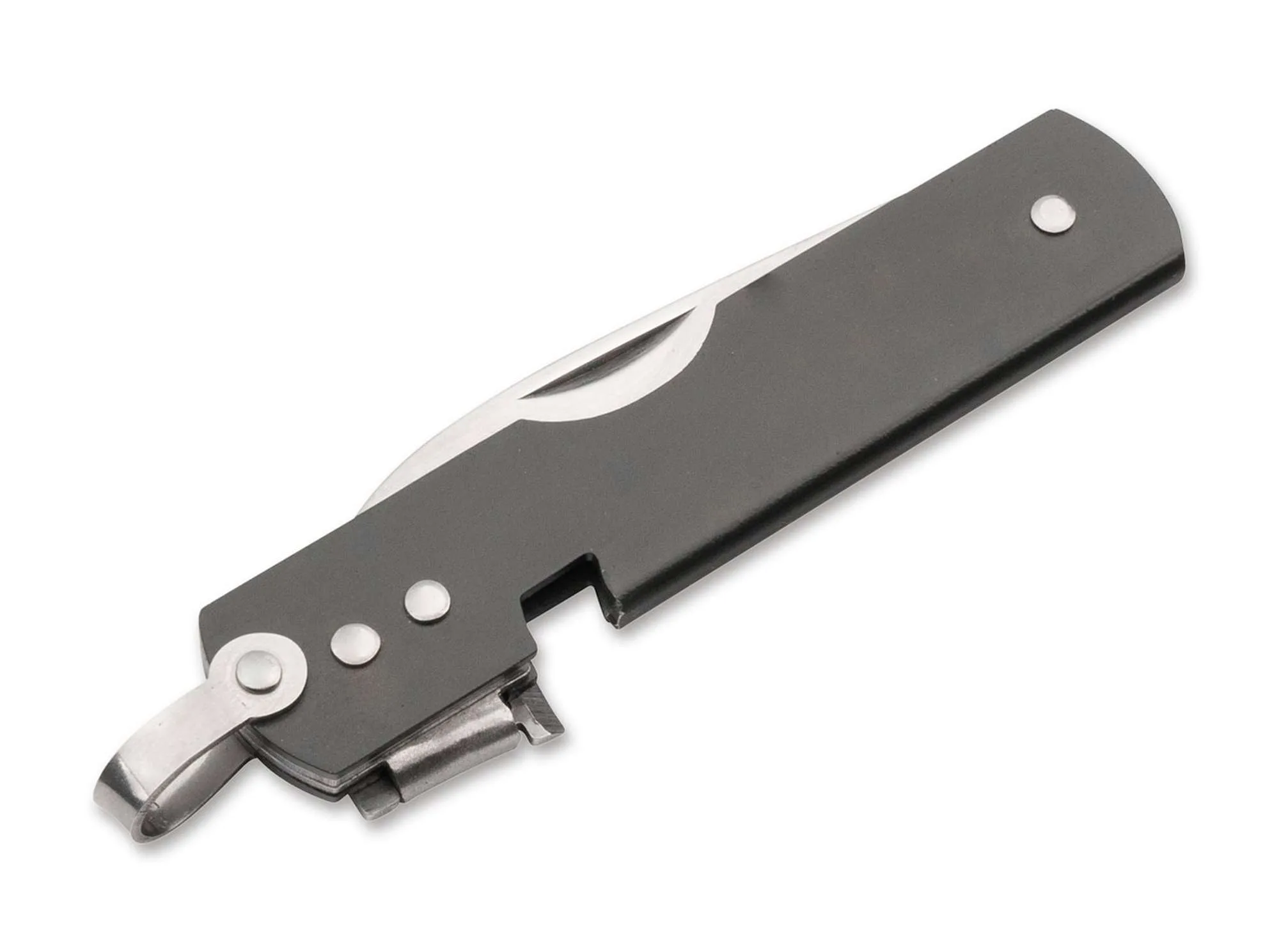 Ten niezwykle mały i płaski nóż zmieści się wszędzie: w dżinsach, zestawie polowym, pudełku na lunch, zestawie survivalowym, a nawet w portfelu. Prosta konstrukcja z giętej blachy nierdzewnej pozwala na tak niskie koszty produkcji, że możesz sobie pozwolić na przechowywanie noża zapasowego w kilku miejscach. Cechą szczególną jest zintegrowany otwieracz do puszek wzorowany na legendarnym amerykańskim otwieraczu do puszek P-38, który jest przymocowany do uchwytu za pomocą dwóch solidnych kołków i można go zablokować za pomocą zaczepu zabezpieczającego smycz, aby zapobiec przypadkowemu otwarciu. Średnio spiczaste ostrze wykonane ze stali nierdzewnej 440 posiada wyszczerbienie gwoździa jako pomoc przy otwieraniu. Rękojeść jest lakierowana na autentyczny oliwkowy kolor według historycznych wzorów.
