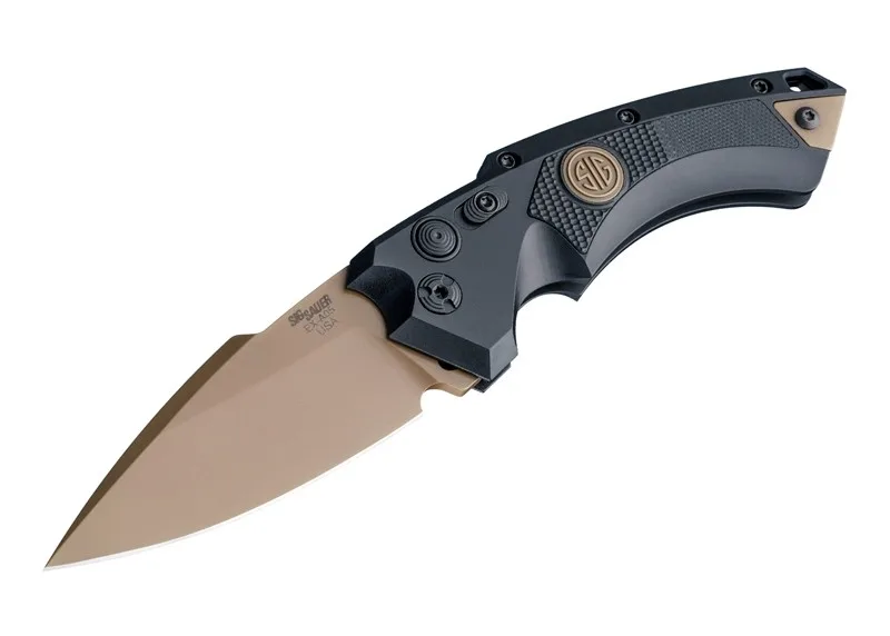 Głownia typu Spear Point z nierdzewnej stali CPM154 o twardości 57-59 HRC i wykończeniu Flat Dark Earth PVD jest automatycznie otwierana poprzez wciśnięcie przyciku, który dodatkowo blokowany jest suwakiem przed złożeniem lub przypadkowym otwarciem np. w kieszeni. Rękojeść wykonana została z anodyzowanego aluminium 6061-T6 z wykończeniem w czarnym macie, na której umieszczono z obu stron znaczek SIG™ w kolorze Flat Dark Earth. Nóż posiada obustronne klipsy typu Deep Pocket Carry (głębokie noszenie w kieszeni). W komplecie zapinany na zamek pouch do przechowywania noża, klips na drugą stronę oraz naklejka z logo Hogue. Długość całkowita 206 mm, długość klingi 89 mm, waga 130 g, grubość klingi 3,8 mm.