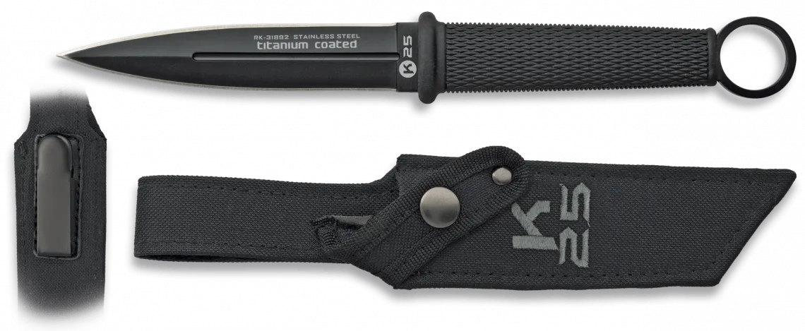 Głownia ze stali nierdzewnej z tytanową powłoką, długość całkowita 250 mm, długość klingi 121 mm, grubość klingi 3.8 mm, waga 98 g, rękojeść z gumy, w komplecie nylonowa pochwa z klipsem.