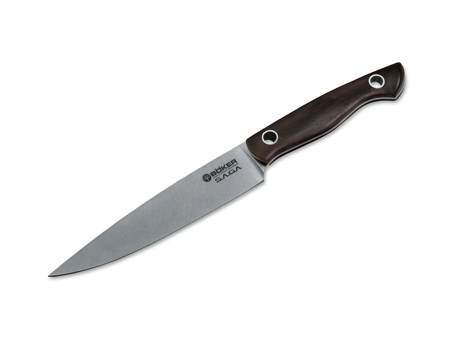 Z naszej kuchni nóż serii Boker Saga, wykonane ręcznie w naszej fabryce w Solingen, wykonujemy mostek i podnieść kwestię „cięcia w kuchni” na nowy poziom. Nasze wieloletnie doświadczenie w noże na zewnątrz, jak również pomysłowości i kreatywności producenta duński Knife Jesper Voxnaes zostały uwzględnione w koncepcji i konstrukcji Saga ustawić ergonomiczny i stukając nowe standardy techniczne. Uważny przeniesienie tego wspólnego know-how w dziedzinie, która gwarantuje kulinarnych pracujących z Boker Saga pod unikalnym doświadczeniem. Łagodnie zakrzywione uchwyty są wykonane wyłącznie certyfikowane importowanego afrykańskiej Blackwood. Dzięki wysokiej twardości i Blackwood gęstości mieści między innymi ugruntowaną pozycję w europejskich instrumentów dętych drewnianych. Już przy pierwszym kontakcie z serii Saga noża Böker skuteczne ergonomia jest jasne: Każdy arkusz, każdy pęd w linii położona na swoim miejscu w dłoni i zapewnia pełną kontrolę i doskonałe wrażenia cięcia. Jaskółczy ogon rozszerzyły Uchwyt końcowy z większych modeli przynosi dodatkową przyczepność. Wysoka stabilność zawdzięcza BöKER Saga całkowicie ciągły Erl który biegnie przez nóż (w tej samej konstrukcji, jak wiele ostrza myśliwskiej) od wierzchołka ostrza do końca uchwytu. Aby uzyskać optymalne działanie cięcia, jest pełna powierzchnia szlifująca tarczy z Stonewashed końca, ale również wybór 440C stalowego ostrza, która jest doskonała utrzymywanie krawędzi i odporność na korozję stali przekracza normalne nóż kuchenny pory. Wykończenie powierzchni wytworzonych w specjalnym procesie mielenia charakteryzuje się doskonałymi właściwościami ślizgowymi w ciętego materiału, co sprzyja już doskonałą wydajność cięcia. Ponadto mikrostruktura Stonewashed sam jest bardzo odporna na zarysowania, jak to często wizualnie verlieren..Den w strukturze akcent umieścić dużych pustych nity bezbłędnie noszą znamiona Jesper Voxnaes. Nóż Narzędzie to jest bardzo poręczny mix noży szefa kuchni i noże paring. Najczęstszym zastosowaniem noża wszystkich celów w kuchni jest przetwórstwo owoców i warzyw, które pozwalają zarówno obrane mogą być również cięte, jak również. Ale mniejsze ryby i mięso można zatem łatwo wyciąć. Ponieważ grunt po obu stronach noża jest często potrzebne, powinno być w każdej kuchni.