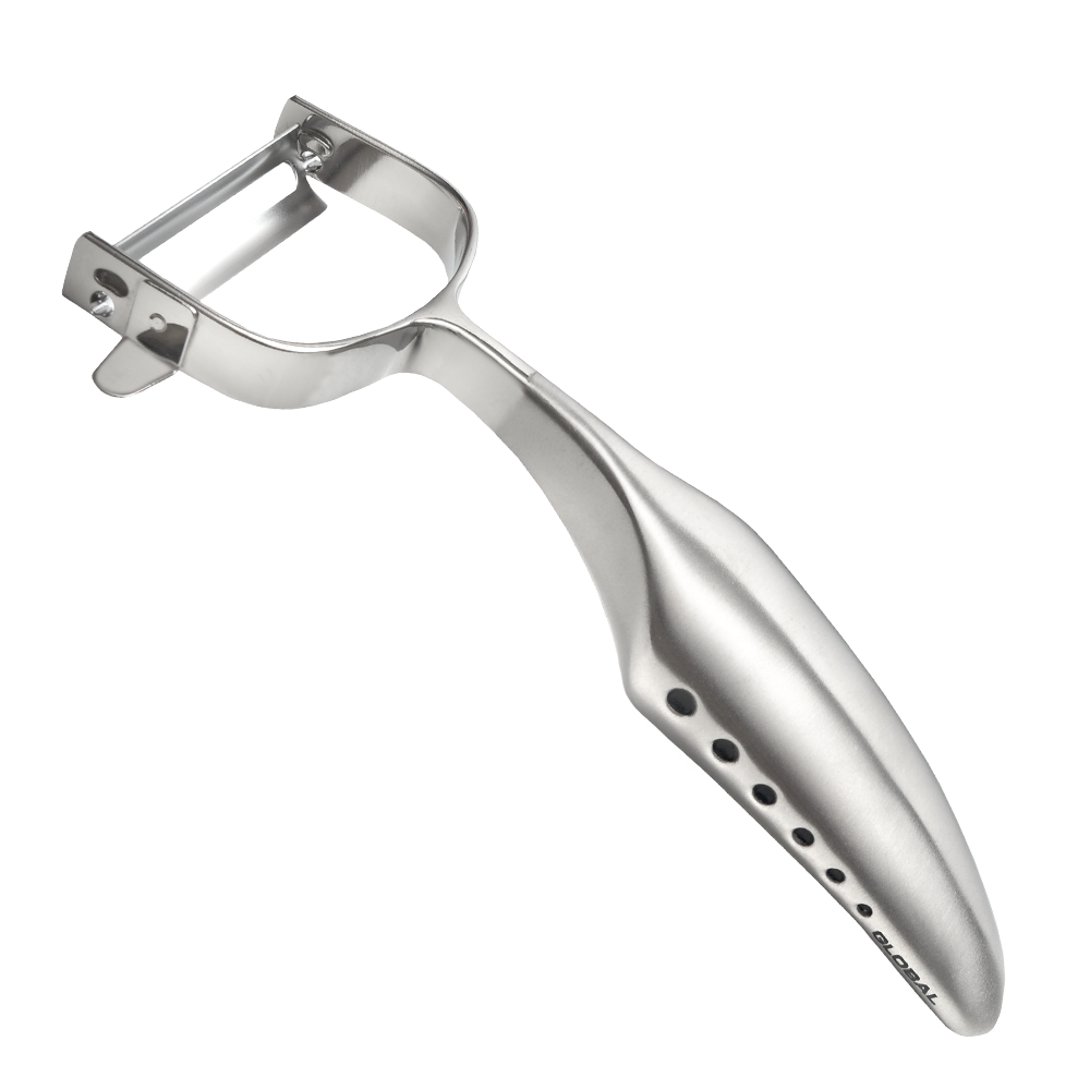 Funkcjonalna obieraczka do owoców i warzyw, która nie ustępuje znakomitym nożom Global zarówno pod względem ostrości, jak i eleganckiego designu. Gładkie ostrze ścina skórkę równo i wyjątkowo cienko, dzięki czemu produkty zachowują więcej błonnika i cennych składników odżywczych.