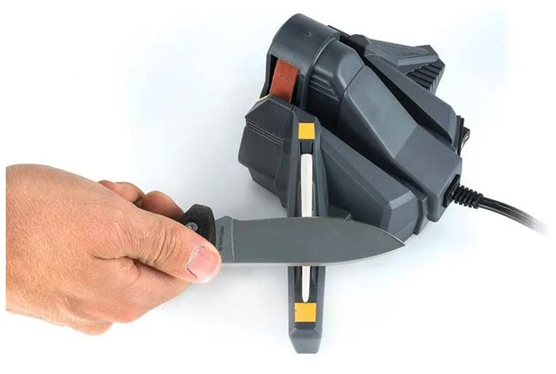 Jego obsługa jest maksymalnie uproszczona: jeden kąt ostrzenia (25 st. na stronę), stała prędkość, pewne i stabilne położenie na stole roboczym. Taśma P120 jest zabezpieczona solidną obudową. Dzięki stałej prędkości obrotowej trudniej jest o uszkodzenie krawędzi roboczej noża, a ostrzenie jest zawsze powtarzalne i daje ten sam wynik. Otwory posiadają wkładki które pozwalają na pozycjonowanie ostrzonego narzędzia w pewny i stabilny sposób. Dodatkowym elementem poprawiającym efekty otrzenia, jest ceramiczny pręt o zmiennym przekroju. Pozwala on na wykończenie i końcowe wygładzenie krawędzi tnącej. Jego kształt pozwala też na ostrzenie ostrzy z ząbkowaną krawędzią tnącą. Idealny sprzęt do garażu czy warsztatu – zawsze pewny i gotowy do działania. Naostrzy wszystko, od scyzoryka do maczety.