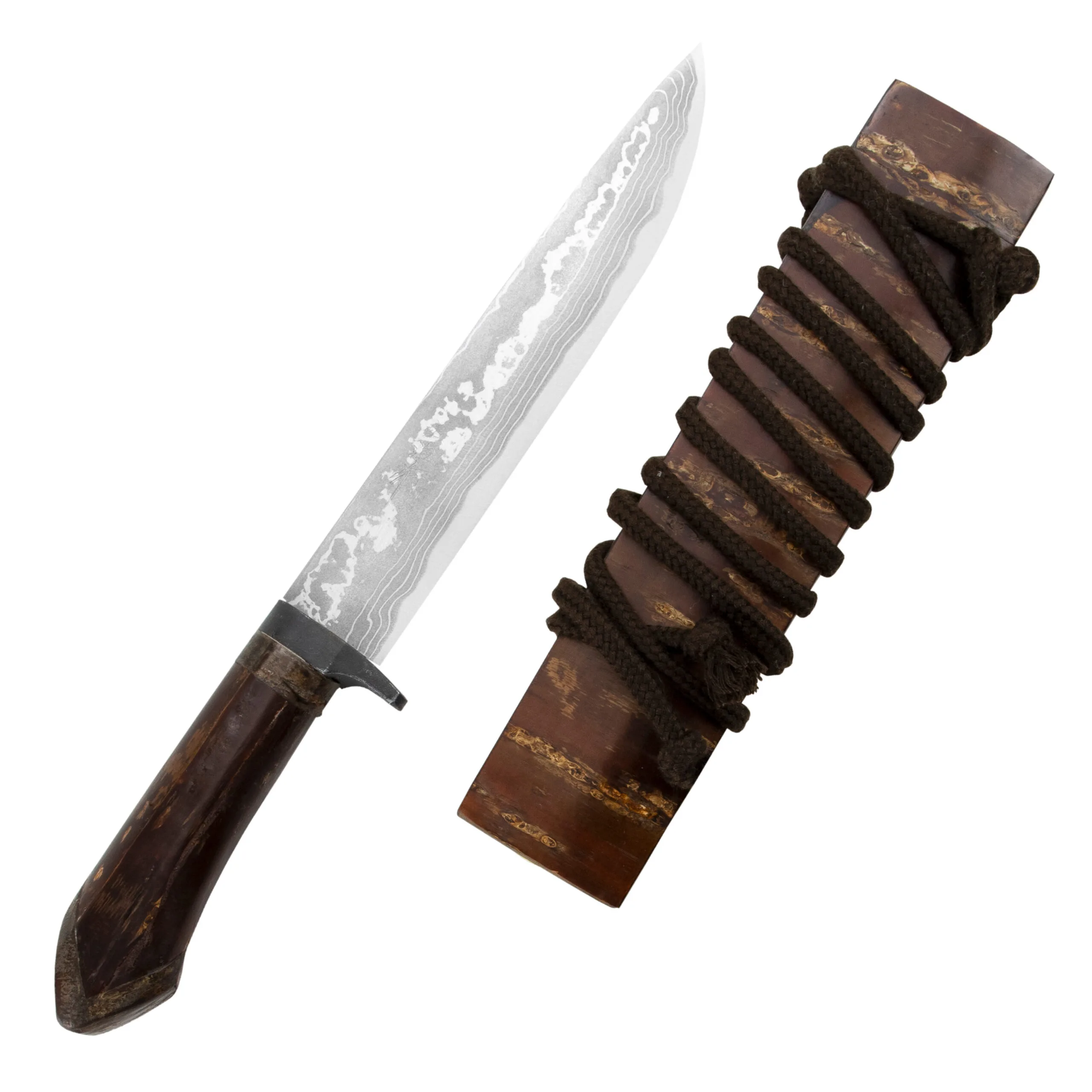 Nóż outdoorowy wykonany przez światowej sławy mistrza kowalstwa – Takeshi’ego Saji. Wykonany jest ze stali węglowej Shirogami, bardzo twardej, co pozwoli mu bez problemu na utrzymanie ostrości na cały okres wyprawy. Znaczna grubość klingi i pół pełny szlif nadają mu niezwykłej wytrzymałości, sprawdzi się nawet przy cięższych pracach. Drewniana rękojeść oryginalnie wykończona fornirem zapewnia pewny chwyt. Takeshi znany jest ze swojego nietuzinkowego stylu, widać to m.in. po pochwach noży, które również wykonane są z drewna i wykończone fornirem.