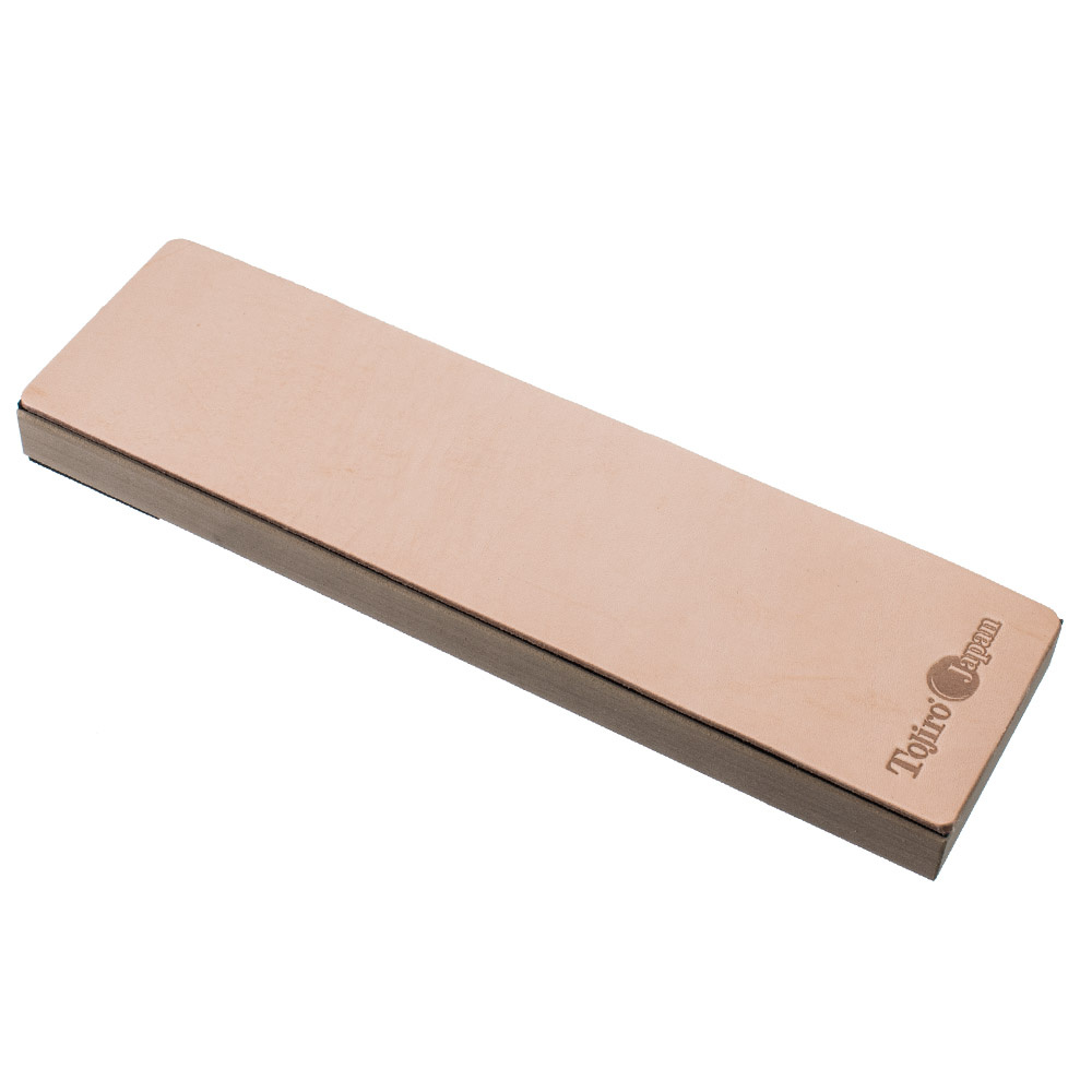 W celu osiągnięcia płynniejszego odczucia krojenia, warto pomyśleć o tak zwanym “stroppingu”, czyli końcowym wyrównywaniu i polerowaniu krawędzi tnącej na miękkim materiale, takim jak skóra. Jedną z często spotykanych metod jest skórzany pasek, przymocowany do ściany lub drzwi, a firma Tojiro zaproponowała wygodniejszą opcję, czyli „skórzany kamień”.