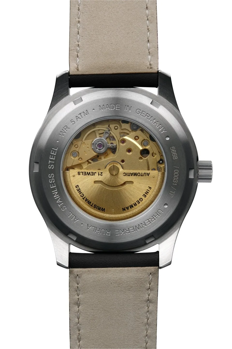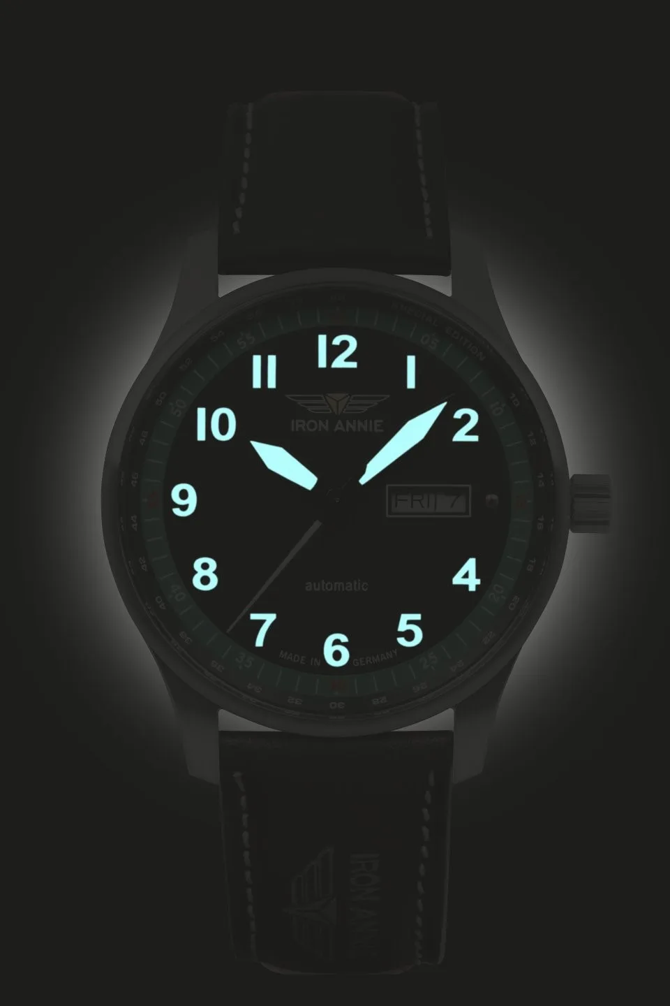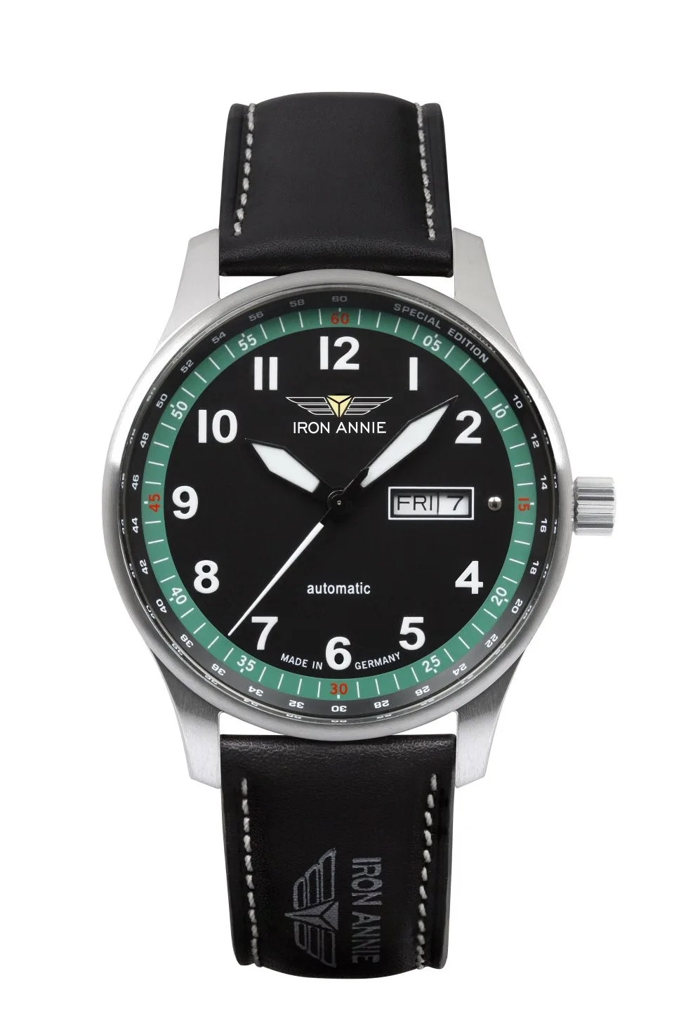 Miyota 8205, tarcza czarna 42 mm, wskazówki białe z Super-LumiNova, szkło mineralne K1, datownik, pasek skórzany, wysokość 13 mm, WR 10 ATM