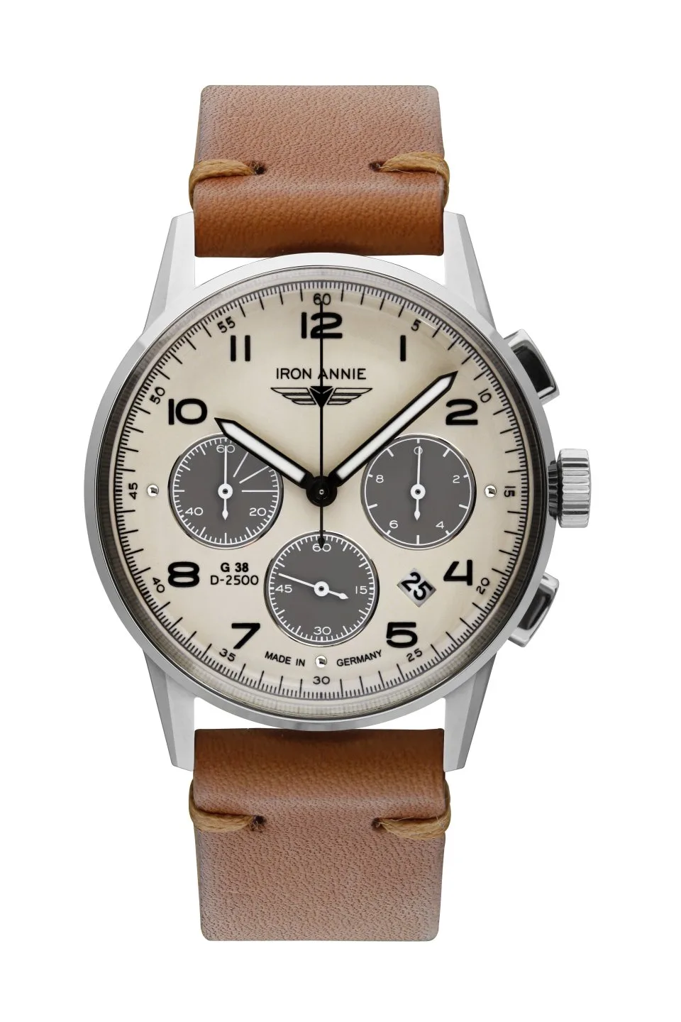 Miyota 6S20, chronograf, szkło mineralne K1, tarcza beżowa/ czarna, Super-LumiNova na wskazówkach, średnica 42 mm, wysokość 12 mm, masa około 75 g, 10 ATM, pasek skórzany brązowy