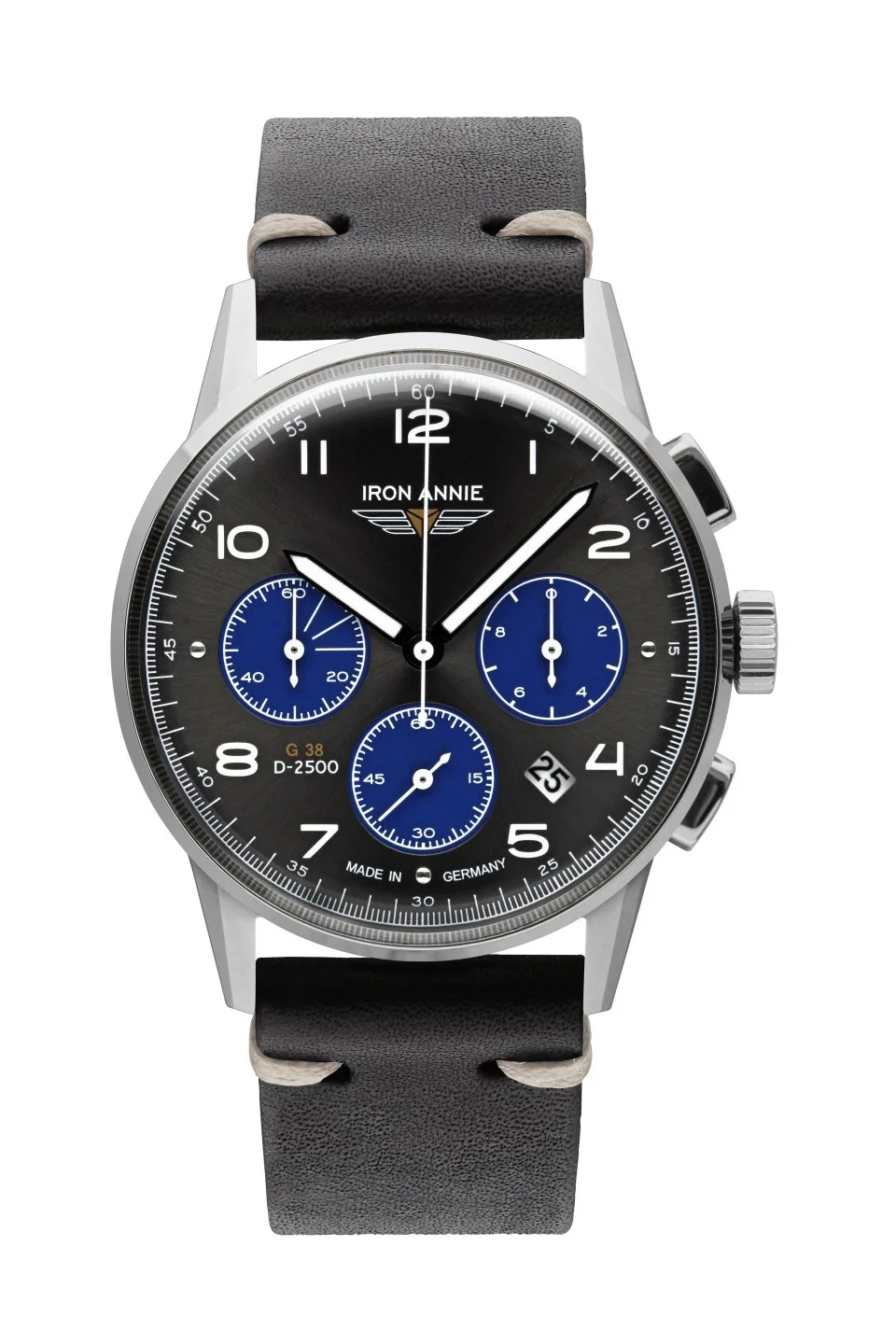 Miyota 6S20, szkło mineralne K1, tarcza czarna, chronograf, datownik, Super-LumiNova na wskazówkach, średnica 42 mm, wysokość 12 mm, masa około 75 g, 10 ATM, pasek skórzany