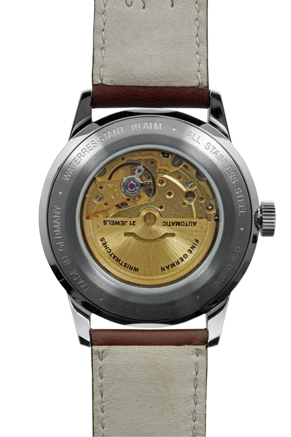 Miyota 8205, szkło mineralne K1, dekiel ze szkłem mineralnym, tarcza beżowa z Super-LumiNova, wskazówki czarne, koperta ze stali nierdzewnej, średnica 42 mm, wysokość 14 mm, masa ok. 85 g, WR 10 ATM, pasek skórzany brązowy