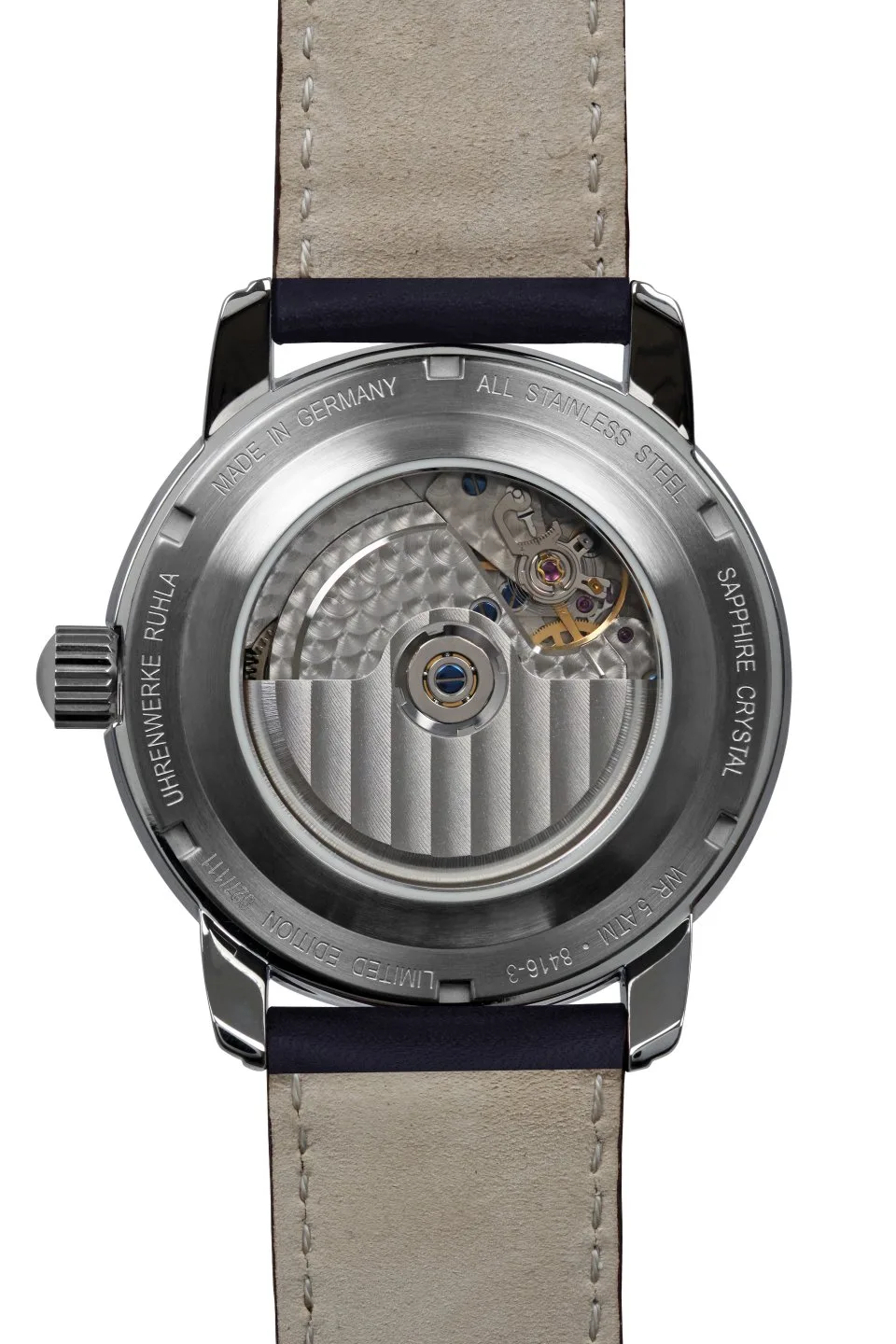 ETA A07.161, tarcza granatowa, średnica 43 mm, szkło szafirowe, wskazówki z Super-LumiNova, koperta stalowa, dekiel stalowy, wskaźnik rezerwy chodu, WR 5 ATM, pasek skórzany, wersja limitowana